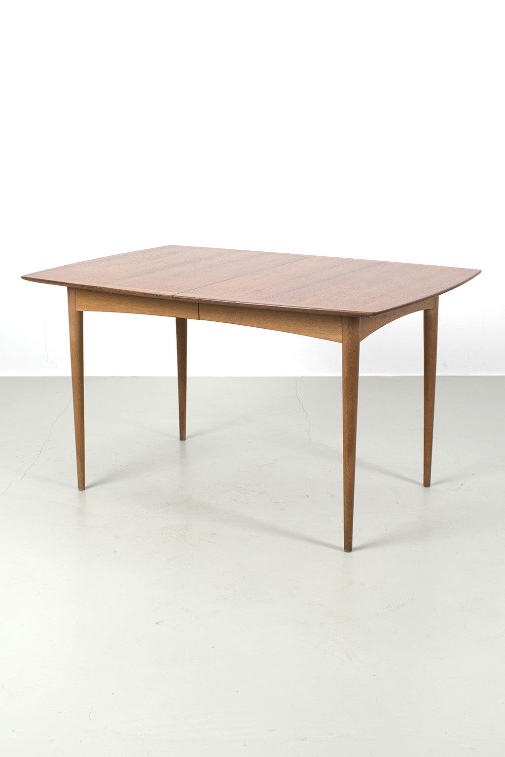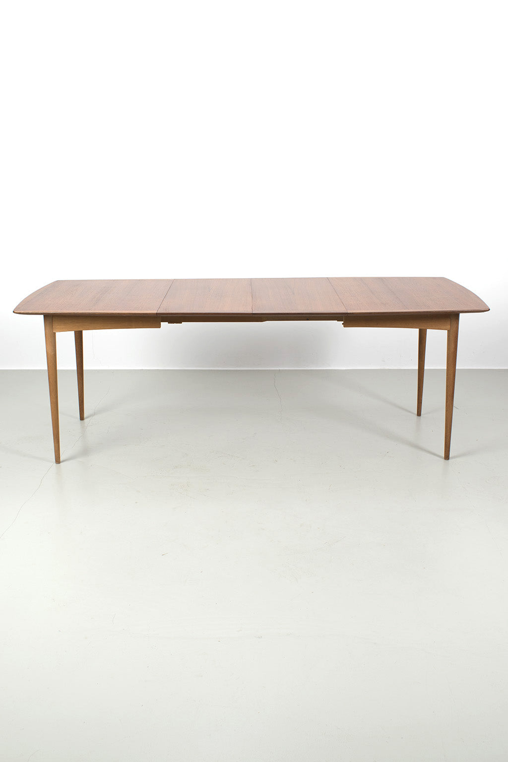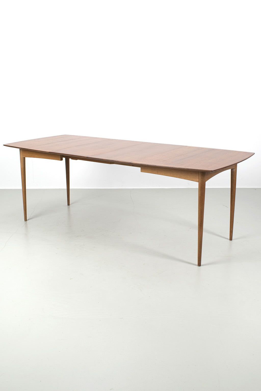 Prachtige uittrekbare eettafel van eiken fineer. Heeft twee extra bladen waarmee u de tafel tot een lengte van 210 cm kunt uitschuiven. De eettafel heeft wat gebruikssporen zoals wat verkleuring en krassen (zie foto’s). In een normale vintage staat.